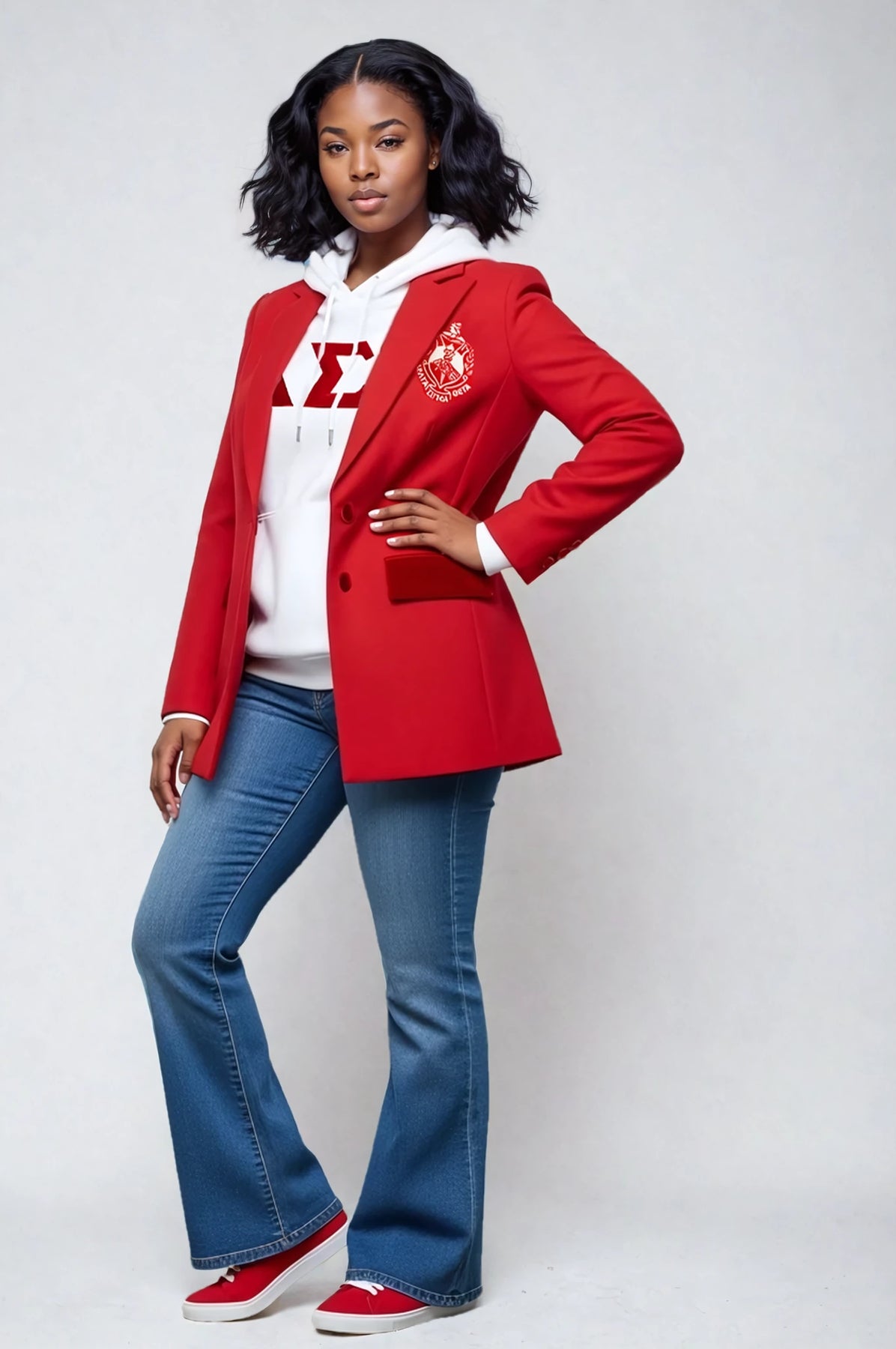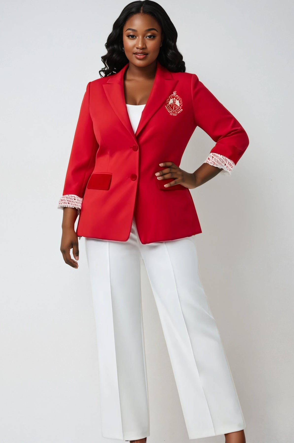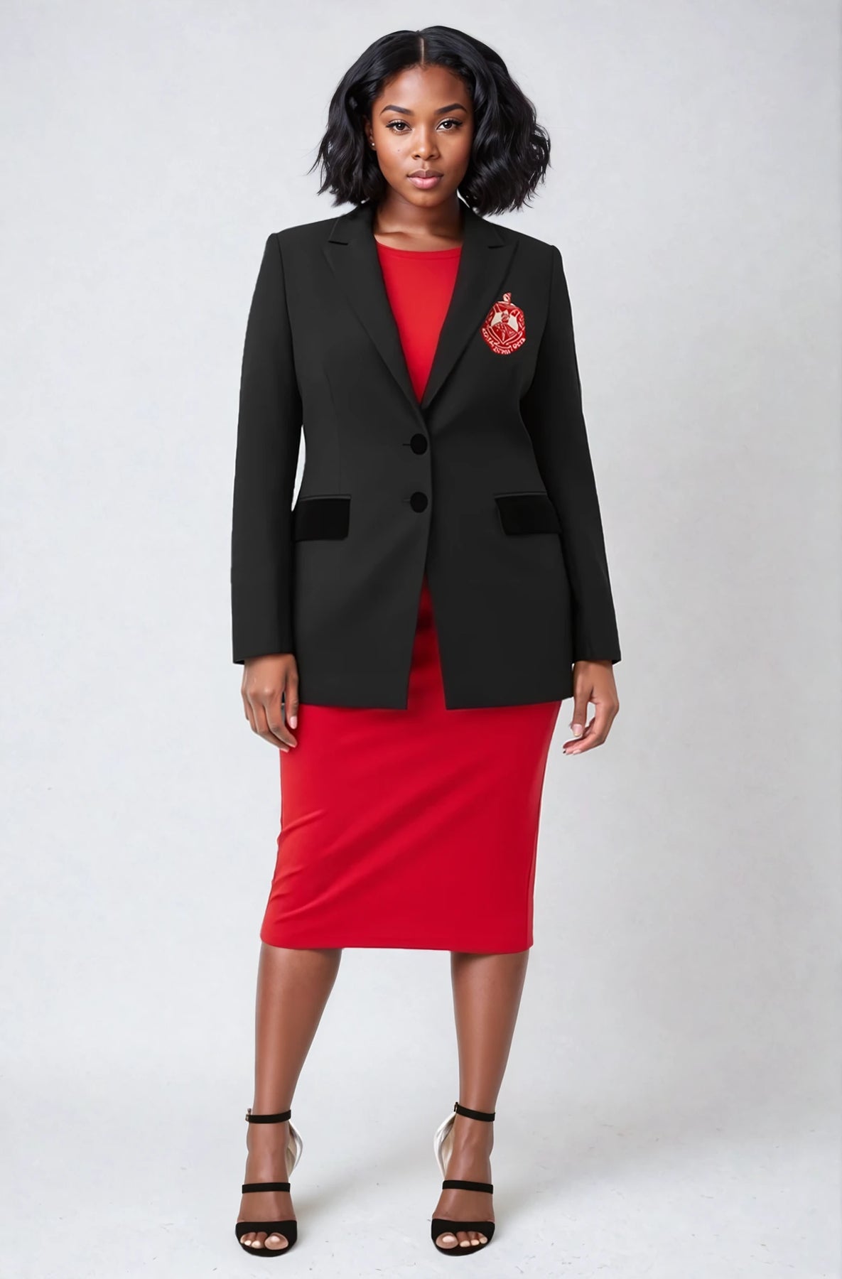 Olivia the Blazer is that “oh, you noticed?” piece. She’s sharp, luxe, and just a little bit extra—available in red or black, with velvet pocket flaps and buttons for that touch of drama. Crafted from a luxe blend of 88% premium polyester and 12% stretch spandex, this blazer delivers a flawless drape with just the right amount of give. Pop the collar and you’ll catch a flash of velvet underneath (because details matter). The custom lining is all about Delta Sigma Theta pride—bold writing inside, so you’re repping even when the blazer’s closed. And yes, she’s got the DST crest over the heart, because you deserve to wear your membership in style.