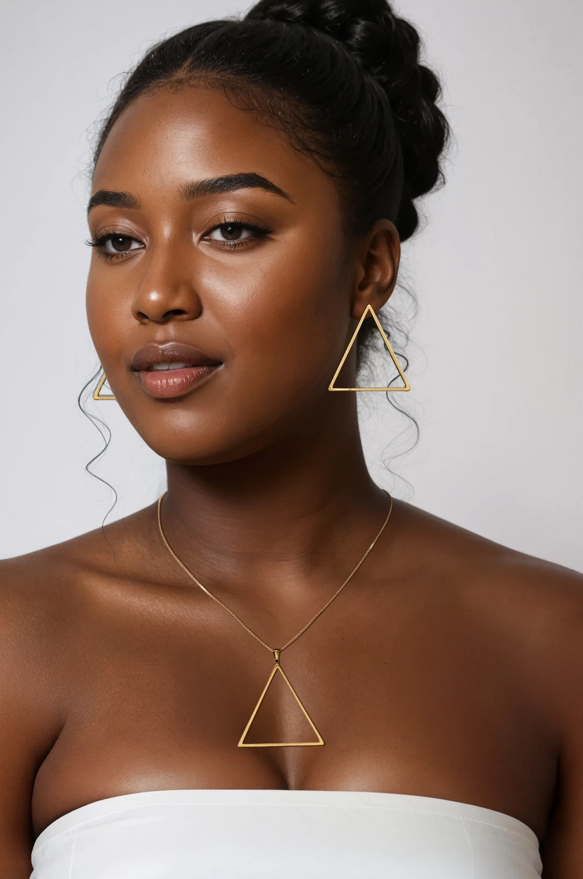 The Viv Set is a minimalist statement-maker for Delta Sigma Theta members and lovers of bold, geometric style. Crafted from gold stainless steel, the striking delta-shaped (pyramid) pendant and matching earrings are sleek, symbolic, and always on point. Durable, tarnish-resistant, and lightweight—this set is designed to last and elevate any look.
