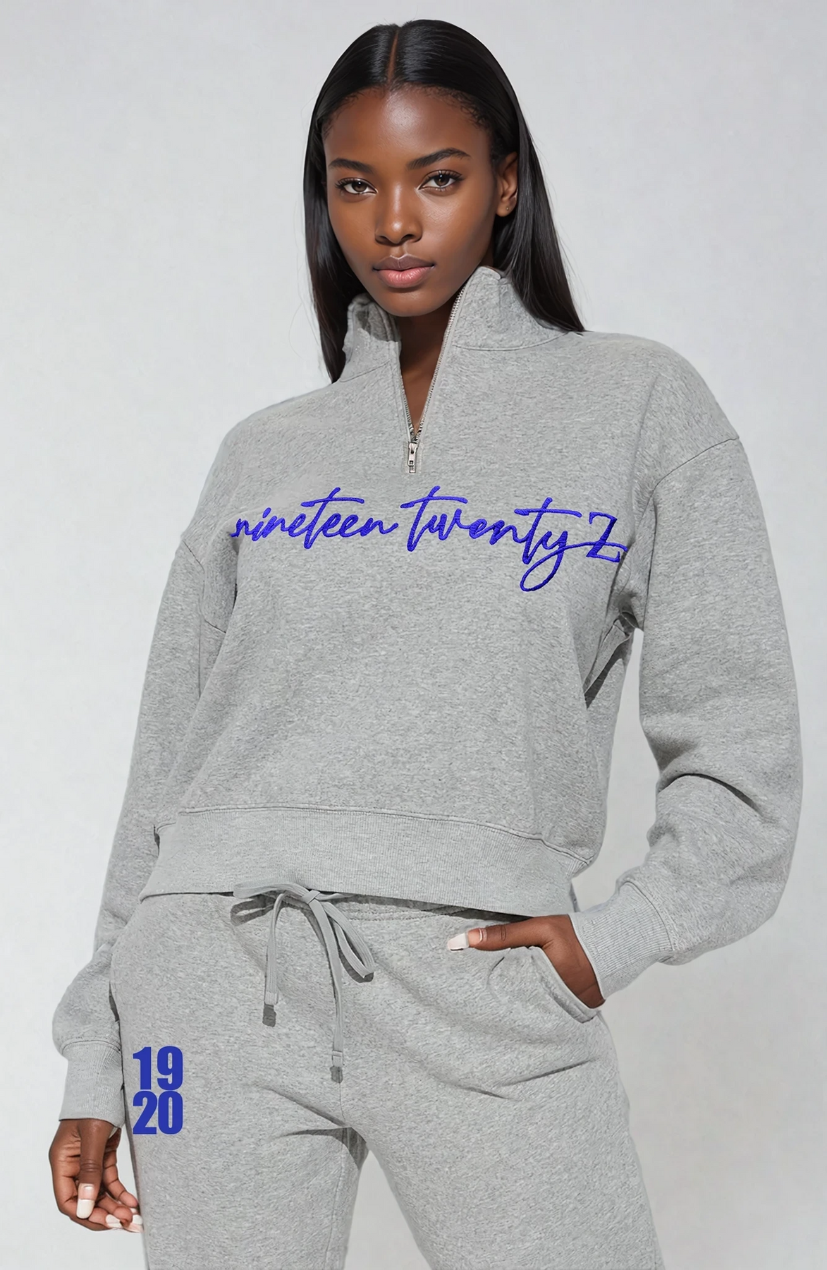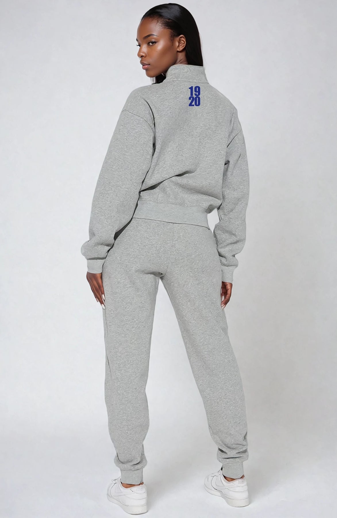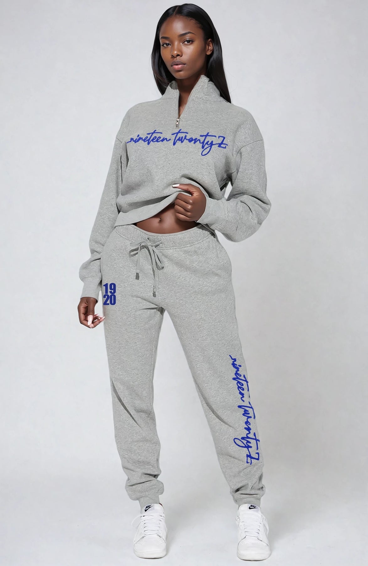 Our new Simone Fleece Jogger Set is a true standout—soft, smooth, and designed for both comfort and style. The half-zip cropped sweatshirt pairs perfectly with cozy jogger pants featuring exterior drawcords, pockets, and a comfy rib knit waistband and cuffs. Embroidered “Nineteen Twenty” logos across the chest and down the left leg add that signature Zeta flair. Easy to wear, easy to love—this set is a real catch!